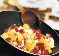 4 porsjoner3 ms jordnøttolje1 ananas3 bananer500 g jordbær3 ms sukker1 dl hasselnøttersjokoladesausSkjer frukten i terninger uten å blande dem. Varm wokpannen og hell på oljen. Vend ananas i oljen i ca. 1 min. Tilsett banan og jordbær. Vend i sukkeret.Tilsett evt. litt rom og brenn av.Kan også serveres med vaniljeis.Flere ulike frukter kan brukes.Harde frukter legges i pannen en stund før de myke.