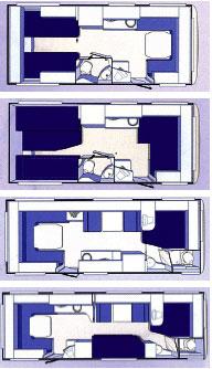 Tar vi steget inn i vognen møter det oss et helt nytt design, både i utforming og farger. Planløsningen er ganske så tradisjonell, men de nye elementene gir oss et inntrykk av noe nytt likevel. Nye polster, en moderne kjøkkenbenk og bedre belysning fra et antall spotter. Først til planløsningen. Knaus-modellene leveres nå med et større utvalg av planløsninger.Som vi kan se av skissen er denne vognen utstyrt med rundsittegruppe foran, kjøkken og bad i midten, og dobbeltseng og kombinerte overskap/køyesenger bakerst. Nærmeste sammenligning til denne vognen er 580 UE, som vi forklarte tidligere. Vi nevnte nytt polster, Romance eller Festival, på puter og sittegrupper. De er gjennomført med en mørk blå grunnfarge på sitteputene, et fargespill i den samme blåfargen, oransje og gult i ryggputene og en dyp oransje i alle løse puter. Virkelig smakfullt.Kjøkkenbenken er også noe for seg selv. Knaus har kuttet ut de tradisjonelle kokeplaten med fire bluss, og erstattet denne med tre bluss som ligger etter hverandre. Det gir ikke bare et mer moderne utseende, men det er også mer praktisk da det frigjør arbeidsplass på benkeplaten.