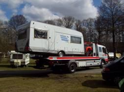 Vi dro hjem til Danmark den 11. april. Vi hadde pakket bilen med alt det utstyret fra campingvognen vi kunne ha, så ville verkstedet sørge for at resten ble sendt til oss. Campingvognen var ikke ferdig , så vi hadde egentlig ikke mye å gjøre i Tyskland, så vi bestemte derfor å kjøre hjem. Når vi er kommet hjem blir vi den 16. april informert om, at campingvognen nå befinner seg hos Neergaards Camping i Hedehusene. Vi reiser dit og tømmer campingvognen for alt inventar, og samtidig inspiserer vi for siste gang skadene, men finner ikke noe nytt. Men vi var godt forberedt på at campingvognen vår nok ville bli karakterisert som totalvrak, og derfor tok vi en titt på noen brukte vogner hos Neegaard, og falt for en Hymer 540 TL.