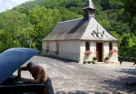 Etter denne spaserturen, ble vi enige om å kjøre en tur sammen. Vi tok bilen tilbake til Saint Geniez og fikk espresso kaffe på min ”stambar”, hvoretter vi kjørte opp i fjellene. Det ble en kort tur for Land-Roveren ga fra seg en mistenkelig lyd, det hørtes ut som om det kunne være vifteremmen som var kilde til støyen. Vi stoppet rett foran et lite kapell og undersøkte bilen.