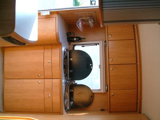 Inngangen til selve bobilen er i den bakerste delen og det gir noen andre planløsningsmuligheter. Bakerst i bobilen er det bl.a. kjøkken. Oppvaskkum og de 3 gassblussene tar selvfølgelig en del plass, men likevel er det god benkeplass. Det er også godt med skapplass og fordelingen av skap og skuffer er fornuftig.Separat skap til søppel er en fordel. Vinduet ved komfyren fungerer fint som damphette, når været tillater åpne vinduer.Kjøleskapet med benkeplass står til høyre for døren, når man kommer inn. Over det henger TV-skapet. Dersom man har flatskjerm er det mulig å montere den på veggen mellom kjøleskapet og TV-skapet, og så bruke TV-skapet til andre ting.