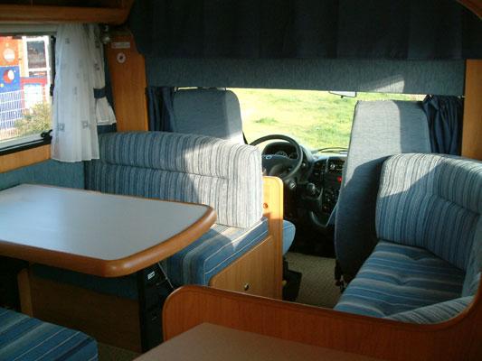 I midten av bobilen er det oppholdsrom. Langs den ene sideveggen er det en 3 personers sofa i bilens lengderetning på den andre siden en konvensjonell 4 personers sittegruppe. Bordet står i forbindelse med de 4 sitteplassene, men kan utvides slik at alle 7 sitteplasser har bordplass.Det samme gjelder om natten, da bordet kan slås ned, slik at sittegruppe og sofa danner en stor dobbeltseng. Man kan også velge en løsning med en mindre dobbeltseng og sofa som enkeltseng. Både over sofaen og sittegruppen er det skaper i tillegg til et garderobeskap ved siden av badeværelset.