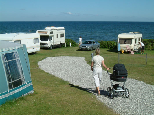 Vi fortsetter ned på stranden, der dagens solbadende gjester så smått er i ferd med å pakke og dra hjem til campingvognene på plassen. En far og sønn er imidlertid i ferd med å sette kanoen på det stille vannet. De kan få tid til en liten tur, før det er tid for mat. Lengre ned på stranden håper en sportsfisker på litt flaks, kanskje er ikke kveldsmaten i hus ennå.Mens Mathias er i full gang med å samle stein og muslingskall, går det opp for meg, hvilken herlig campingplass vi har ”flyttet” inn på. Det er høyt under taket, frisk luft, deilig natur, barnevennlig strand og god plass til, at alle kan gjøre nøyaktig det de hadde planer om, før ferien startet. Det være seg å døse i liggestolen, til en tur på golfbanen eller på sykkel, eller bare syssle med sine egne små ting og gjøre noe av alt det, man ikke rekker til daglig. Det er rolig, selv om der egentlig er mange barn.