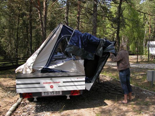 Carsten:Jeg er overrasket over hvor enkel den er å slå opp. Det høres kanskje overdrevent ut, men det tar virkelig bare 30 sekunder. Man åpner lokket, løfter det rundt, så det blir gulv. Deretter løftes to sidestenger, som spenner ut teltduken og så er man på plass. Vil man ha ekstra stabilitet sveiver man ned de fire støttebenene.Linette:Jeg har alltid ganske mye tøy med på turene våre, og når det er med telt, ligger det i sportsbagger i bilen. Denne gang la vi Combi Campens fortelt inn bak i bilen og så pakket vi tøyet i lasterommet under dobbeltsengen. Jakker og hva man ellers kan få bruk for i løpet av dagen lot vi ligge i bilen. Vi har som noe ekstra fått satt på en frontboks. Det gir ekstra oppbevaringsplass.Det sjenerer ikke meg å kjøre med Combi Campen bak på bilen. Man merker ikke at den er på og utsynet er bra. Den er også utrolig lett å koble av og på og kan skyves på plass av en person. Det overrasker meg.