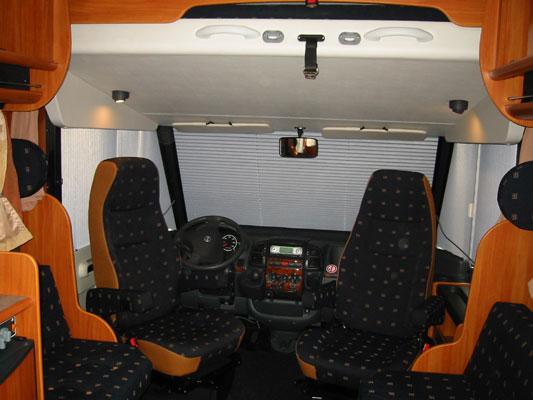 Den såkalte oppholdsstuen er plassert der man kommer inn i vognen til høyre for kjøkkenet. Her er det plassert en sittebenk på hver side med et bord imellom, i tillegg kan begge stolene i førerhuset snus, slik at det er god plass til 6 -7 personer ved bordet. Under benkene er anbragt henholdsvis ferskvannstank og gasskasse med utvendig tilgang.Praktiske ting:Bobilen er utstyrt med både ferskvanns- og spillvannstank. Spillvannstanken tømmes med nøkler utenfra. Bak kjøkkenskap og under bakerste seng finnes rom til oppbevaring av campingmøbler og tilbehør, grill m.m. Over fører- og passasjerstolene ”henger” en ekstra dobbeltseng, som kan legges ned om natten, dersom man har bruk for en ekstra seng. Denne helintegrerte modellen er lys og vennlig med pent stofftrekk, store åpningsbare vinduer og takluker.