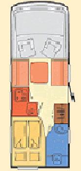 Inngangen til bobilen skjer midt i bilen. Når man kommer inn i bilen finner man det praktiske vinkelkjøkkenet med overskap, vask, tre kokebluss, skap med uttrekksskuffer til gryter og panner samt en bestikkskuff og et 89 liters Dometic kjøleskap, inneholdende en 6,5 liters fryseboks.Toalett/baderom:I den bakerste delen av vognen finnes badeværelset som etter campingforhold er romslig. Et stort Thetford toalett med elektronisk spyling finnes i enden av rommet og over det sitter et praktisk innredet baderomsskap. Et forheng skjermer mot vann på toalettet da dusjen er plassert i umiddelbar nærhet.I motsatt ende av toalett og baderom finnes håndvask, speil med hylle og underskap, som avskjermes med to pleksiglassdører mot vannsprut. En god innredning.