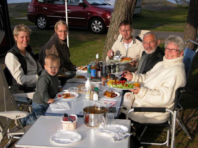 Britta og Pernille står for kveldsmaten og før vi får snudd oss, er et veldekket bord klart og vi kan sette oss alle sammen. Ole har åpnet et par gode flasker med rødvin, og praten går livlig i campingleiren, mens natten stille og rolig tar over. Vi kryper til køys i hver vår vogn med vinduene åpne. Vi faller alle i søvn til bølgeskvulp – så nær ligger vi vannet.