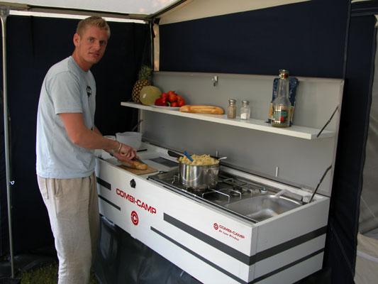 Linette og Carsten står for kveldsmaten, og vi andre har bare fått vite at vi skal ”komme” kl. 18 med tomme maver. Carsten forteller, at han synes det er artig å lage mat, men at han og Linette for det meste deler på oppgaven. Kjøkkenet deres er på den ene siden ikke særlig stort, men på den andre siden behøver det ikke være større. Det er kjøleboks, tre gassbluss og rennende kaldt vann. Avlastningshyllen i ”lokket” er praktisk.