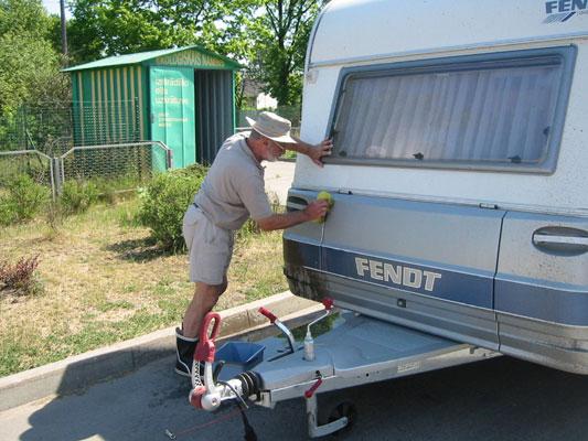 Vi er fremme allerede før lunsj. For det første fordi vi ikke kjører så langt, men også, fordi vi er flinke til å komme av gårde om morgenen. Vi har alle et temperament, som gjør, at vi vil ha noe ut av dagen. Ole mener at det er på høy tid at jeg får vasket fronten på campingvognen, som er blitt veldig møkkete, siden vi kjørte inn i Russland. Han har helt rett og i dag har vi tid.