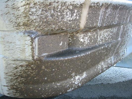 På veien mellom den finske grensen og St. Petersburg kjørte jeg gjennom noe søle, og nå har det satt seg skikkelig godt fast. Vi starter med å bløtgjøre det hele med vann, men vi ser raskt at det sitter ekstremt godt fast. Jeg har tatt med et rengjøringsprodukt, som heter Ren Fritid, og som jeg har hørt mye positivt om, men nå skal det virkelig bli satt på prøve.