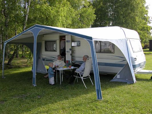 Vi har egentlig ikke bodd på så mange campingplasser med gress, så i dag vil vi benytte anledningen til å sette opp forteltet. Jeg setter i gang med å legge ut stengene i gresset, der hvor de skal brukes. Britta og Ole hjelper meg med å trekke forteltet på campingvognen, og i løpet av en halv time har vi dobbelt så mye plass. Britta og Ole, som tidligere har campet mye med campingvogn, men som de siste årene utelukkende har kjørt bobil, er imponert over utviklingen. De husker forteltoppsetting, som noe som tok tid. Noe som var tungt og vanskelig. Men slik er det ikke lenger. Jo, kanskje de første par gangene.