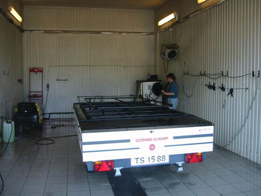 Linette og Carsten hadde sett en bensinstasjon med en mindre vaskehall med høytrykkspyler rett før campingplassen, så før de stiller opp, vil de også få gitt Combi Campen en omgang. Den er nesten uigjenkjennelig etter de mange kilometer gjennom støv på hullete veier – spesielt i Russland. En halv time senere er de tilbake med en nyvasket teltvogn og 10 kr. fattigere. Det må sies å være verdt pengene.