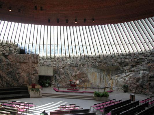 Etter en deilig lunsj fortsetter vi gjennom Esplanaden, der alt står i full blomst, og videre til Tempelplassens kirke, som er en av Europas mest severdige kirker. Kirken er sprengt inn i klippen og hele kirkerummet er ut over vinduspartiene dekket av kobber. Veggene står som ubehandlede klipper.Vi sitter lenge i kirken og nyter stillheten og den fine akustikken. Det spilles klassisk musikk mens vi er der.
