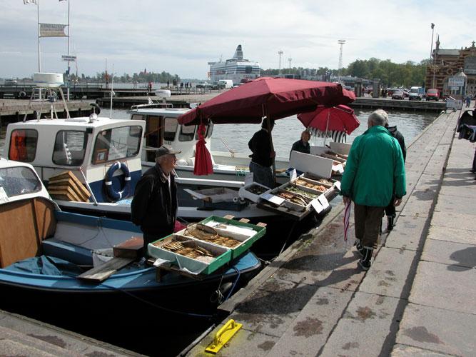 Få hundre meter fra Senatstorvet ligger havnen og Salutorvet. Her er det marked både ute på havnepromenaden og i den gamle Saluhallen fra 1889. Vi bruker lang tid ved de mange bodene og får også kjøpt fersk fisk til kveldens grilling.Det er en herlig stemning på havnen. De mange bodene med friske blomster, frukt og grønnsaker gir en nesten sydlandsk stemning.