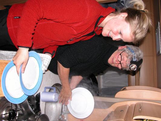Akkurat i det kveldsmaten er unnagjort og Pernille og Britta har kastet seg over oppvasken i campingvognen vår går batteriet vårt tomt for strøm, slik at alt lyset går. Batteriet blir ladet opp, når vi kjører og når vi får 220 V på campingplasser.Nå er det altså ikke mer igjen, men det løser Britta ved å ta på hodelykt. Så er hendene fri til å vaske opp og det er lettere enn å begynne og flytte oppvasken over til Combi Campen eller over i Dethleffs bobilen, som har masser med strøm. Og vaskes opp det skal det, før vi skal sove.