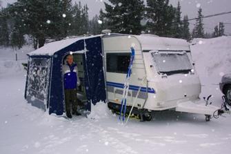 Hemmeligheten bak det robuste forteltet er først og fremst en veldig avansert og solid stangkonstruksjon med to overliggere og en tverrstang, som er plassert i takkonstruksjonens knekk. Det kraftige Zinox stålrørsstativ er dessuten utstyrt med støttestenger med påmonterte skumgummiputer, som presses inn mot campingvognens side og sikrer mot trekk den veien.Knekken i takkonstruksjonen betyr, at døren til campingvognen kan åpnes uten å skrape mot takduken, og ikke minst, at tunge snømengder sklir av og ikke blir liggende på telttaket. Selve teltduken er en veldig kraftig polyester/PVC duk, som er lett å holde ren og som tørker raskt.Det er inngangsdør i begge gavlene, så man alltid kan velge dør på lesiden. Dørene er for øvrig trukket litt fram mot fronten, slik at de ikke kolliderer med campingvognens dør. I bunnen har Snowboy en bred utvendig lekant, som sammen med justerbar plugging sikrer mot vind og snøfokk. Kondensvann er noe alle campere er klar over. Derfor har Snowboy også gode utluftingsmuligheter bl.a. øverst i venstre side med glidelåsåpning og myggnett. Camper man mye om vinteren, vil det være en god ide å anskaffe et termotak, som fanger opp fukten.For de, som godt kan like å campe under ekstreme forhold, har Isabella en vintersikringspakke, som består av to ekstra takstenger, tre ekstra støttestenger og et termotak. Dessuten er det nok en god ide å utstyre seg med fabrikkens spesielle Tarzan-plugger, som er spesielt godt egnet til hardt underlag.Ut over det riktige materiell er det viktig ved vintercamping, at forteltet hele tiden er strammet maksimalt opp, slik at det kan stå i mot regn, storm og snø. I den forbindelse vil den såkalte Herkules-teltoppstrammeren være en nyttig følgesvenn. Snowboy er 180 cm dypt og 220 cm bredt. Det passer til campingvogner med vognhøyder mellom 230 og 250 cm, noe som i praksis vil si nesten alle typer.