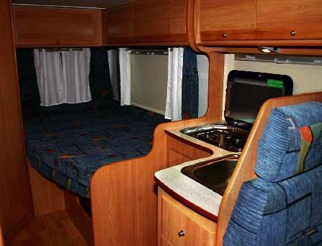 Madrassen i sengen bak har en lengde på 196 cm. Men fra madrassen og framover til du møter veggen (klesskapet) er det 9 cm. Det betyr at sengen med enkle midler kan forlenges til 205 cm. Bredden er 126/ 105 cm, så dette er sengen for de lange og slanke. Skrur du av en polstring på sideveggen øker bredden 4 cm, men da hindres luftsirkulasjonen forbi madrassen. Madrassen er 10 cm tykk og ligger på fjærende trespiler. Hele sengerammen kan vippes opp og gir tilgang til bagasjerommet (135 x 130 x h 58 cm) og kombiovnen (Truma C3402). Over sengen er det overskap, to vinduer og en lampe. Garderobeskapet måler 58 x 49 x h 152 cm. Når det ikke er behov for denne hengehøyden hadde det vært fint med en løs hylle nederst. Under skapet ligger komponentene til elektroinnstallasjonen.