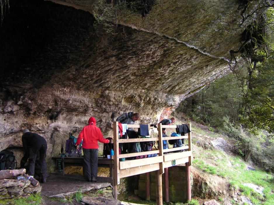 Ut på ettermiddagen kommer vi fram til The Rock Shelter, 1.080moh. – et naturlig klippeoverheng, som skal være overnattingsstedet vårt. Overhenget er vel rundt 3-4 meter, der det er bredest og fra oversiden av klippen drypper det ned vann.Under klippen er der stilt opp en hylle av tre, der vi kan ligge ca. 2 meter over bakken. Og her er akkurat plass til 8 liggeunderlag plassert tett ved siden av hverandre.Øverst oppe under klippeoverhenget har de tidligere beboerne – gullgraverne – murt en liten skinne, som fanger nedsigende vann og hindrer det i å renne ned langs klippeveggen. En genial dryppfanger!
