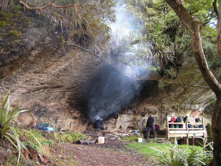 Det varer ikke lenge, før det så smått begynner å gå oppover i terrenget. Jeg legger merke til, at det med jevne mellomrom sitter et lite blått merke på trærne og tror, at vi skal følge den blå-merkede ruten. Men merkene sitter litt ujevnt, så jeg er litt forundret. Chris forklarer, at det ikke er en markering for fotturister, men er en markering for å vise, der det er satt opp feller til å fange possums (pungrotter). Possums er til stor fare for skogen, så myndighetene forsøker på forskjellige måter å få utryddet disse skadedyrene. Ut over fellene legges det også ut gift og visse steder er (de største) trærne dekket med jernplater på stammen, som gjør det umulig for possums å klatre opp langs stammen.Og det er ikke enkelte blå merker vi møter. Her er hundrevis av dem og hver gang kan vi nå se, at det står en eller flere feller enten rett ved stien eller litt inne i skogen. Enkelte inneholder da også fangst. Det er vanskelig å se om det er en possum eller et annet dyr, som er gått i fella.Chris forteller om denne regnskogen, som mest består av løvfellende trær. Vi vil i løpet av neste uke komme til å oppleve forskjellige typer regnskog, forteller Chris, som viser seg å være særdeles godt orientert i botanikken. Faktisk har han vært veldig aktiv i forsvaret av de newzealandske regnskogene.Opp gjennom skogen har vi fulgt The Flora Stream og flere steder skal vi over elven på spinkle hengebroer med brusende fosser langt under oss. Enkelte steder skal vi hoppe fra sten til sten over elven, men det går helt fint. Etterhvert endrer landskapet seg til mer åpent gressbevokst terreng.Mot slutten av 1850-årene ble det funnet gull her i området og gullgraverne valfartet hit. Flere steder ser vi da også rester etter disse lykkejegerne og besøker enkelte hytter.Været er ikke det beste. Det er litt grått og innimellom kommer det litt regn.