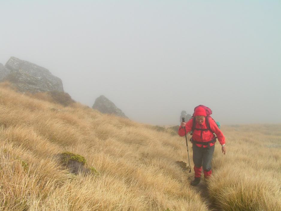 Og så plutselig - som ved et trylleslag – glir skyene ned langs fjellsiden og himmelen åpner seg foran oss.Begeistringen vil ingen ende ta. Nå kan vi se fjell rundt oss. Betagende fjell med snø på toppene.Nå er anstrengelsene ikke lenger forgjeves og med ett er humøret steget adskillige hakk. Mot vest kan vi se fjellkjeden – Tasman Mountains – og rett ovenfor oss reiser Mount Arthur seg med sine 1.795 meter.