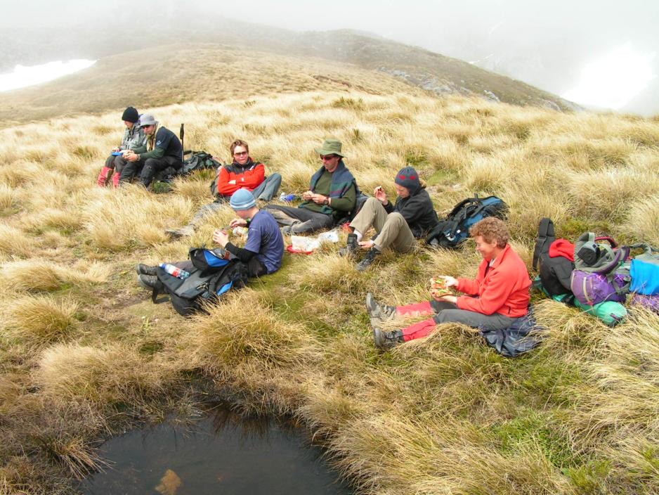 Vi har etterhvert drukket opp mesteparten av det vannet, vi fylte på i morges og Chris lover, at vi snart er framme ved et vannhull, der det kan passe å innta lunsjen.Vi har fortsatt skyene hengende under oss og de er i stadig bevegelse. Det er som om skyene samler seg nede i dalen. På den ene siden av fjellryggen har vi fritt utsyn, mens skyene ligger helt opp til fjellkammen på den andre siden.Vi kommer fram til vannhullet og stopper opp. Det er bare et lite vannhull på ca. 1 meter x 1 meter som blir forsynt fra en underjordisk kilde. Her er ikke noe til/avløp og vannet ser noe grumset ut.”Er det drikkevann?” spør vi. Men selv om Chris bekrefter, at det godt kan drikkes, har ingen lyst til å kaste seg over det. Vi er visst ikke tørste nok!Under lunsjen finner Chris plutselig kaffen!! Den må ha gjemt seg bort. ”Skal vi lage noe”, foreslår han, men ingen har lyst på kaffe nå.Bak oss reiser Mt. Arthur seg og når skyene er borte, har vi et flott skue over mot fjellet.