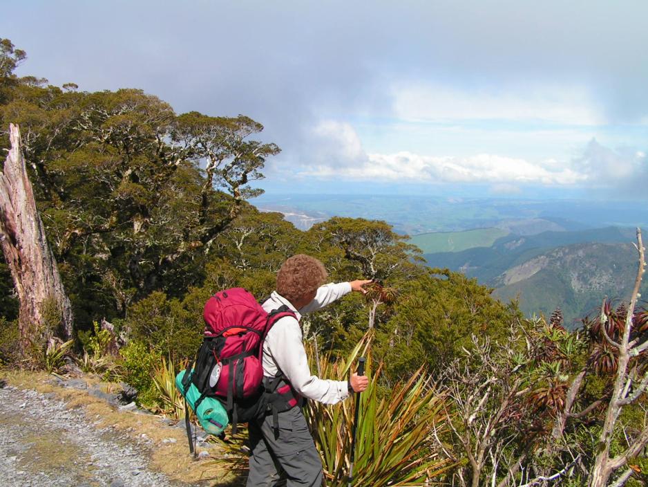Chris har allerede foretatt den nødvendige provianteringen til de første dagene, slik at vi ikke behøver å ”sløse bort” tid på å gå og handle, men kan sette kursen direkte mot Kahurangi National Park i den nordvestlige delen av Sydøya.En av gruppens jenter har glemt kameraet sitt på fiskerestauranten i går kveld og det er med en viss skepsis, at vi stopper for å se, om hun skulle være så heldig, å finne det igjen. Det var jo andre mennesker på restauranten, da hun forlot den i går, og tross adskillige forsøk på å komme i telefonkontakt med restauranten, har det ikke lykkes.Restauranten er stengt, men etter litt banking på døren blir den lukket opp! Jeg og mine øvrige reisefeller sitter avventende i bilen og tipper på funnet/ikke funnet. Selvfølgelig vil det være ergerlig å miste kameraet sitt og ikke minst biidene sine. Så kommer hun ut av restauranten med et stort smil og vinker med kameraet i hånden til oss. Jo, kelneren hadde funnet kameraet og lagt det til side. Jamen, sånn er de fleste newzealendere….Fra Nelson følges veien langs kysten nordover, forbi Motueka og herfra inn i landet. Etter et par timer er vi fremme ved et sted, der tilhengeren kan parkeres. Den er for stor/tung til å ta den med lengere opp i fjellene, der fotturen skal begynne.Chris brer en stor presenning ut på gresset og legger den provianten, som vi skal ha med på turen, på den. Deretter tømmer han ryggsekken og viser oss, hva han tar med. Kun det aller mest nødvendige. ”La nå være å ta med for mye” advarer han oss, ”Dere vil angre på å skulle dra på alt det unødvendige. Telt skal vi ikke ha med. Vi overnatter i det fri, nesten under åpen himmel”.Heretter pakker vi det tøyet samt liggeunderlag og sovepose, vi skal ha med, og så skal maten fordeles. Hver især tar det, de mener de skal ha/bære, og i tillegg til mat skal vi også ha med kokeutstyr inkl. kokeapparat og bestikk. Det tar bare et øyeblikk, så er alt fordelt.Den bagasjen vi ikke skal ha med på turen, er låst inn i tilhengeren, som er parkert på et forsvarlig sted.De fulle ryggsekkene legges inn i bilen og vi fortsetter nå det siste stykket opp til starten av The Flora Saddle Track. Herfra skal vi gå i en sirkel og vil komme tilbake i morgen ettermiddag.