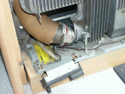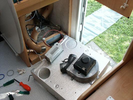 Ultraheat skal festes med 6 skruer, som dras inn bakifra gjennom metallplaten. I bobilen vår var det så trangt bak garderoben at vi ikke kom til for å skru disse skruene. Derfor var vi tvunget til å demontere metalldekselet for å kunne feste vår Ultraheat.