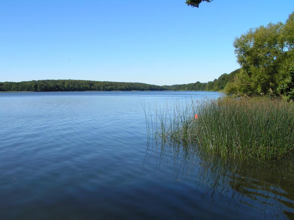 Vi følger Sjøstien langs sjøens sydlige bredd.Caspars Dam ligger vakkert litt oppe i landskapet (uten at vannet renner ut). Vannoverflaten er for det meste dekket av et grønt lag andemat.Nede på Sjøstien igjen sykler vi langs sjøen langs de bratte skrentene og her må du regne med å måtte gå av sykkelen ganske mange ganger – med mindre du er mountainbiker. Området her er et eldorado for mountainbikers og flere steder er der veivisere til de ”bratteste” stedene. Opp og ned går det på den steinete og noen steder sandete stien. Ikke helt uten vansker for oss vanlige syklister!Ved Kollekolle legger båtruten til og her er både bålplass og bord, der vi kan ta en pust i bakken!