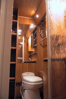 En ny Polar 590 med vaskerom i full bredde med dusjkabinett og mange tredetaljer som gir et varmt inntrykk. Her finnes romslige baderomsskap, et på hver side av speilet, og dessuten et hyllesystem med plass til håndklær, toalettartikler og andre småting. Helfigurspeil og 230 V uttak for hårtørker/barbermaskin.