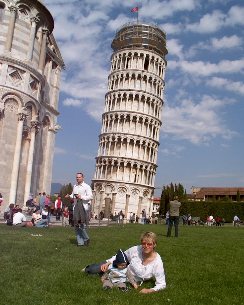 Vi har nettopp forlatt campingplassen, etter å ha sjekket inn og funnet plassen for campingvognen. Alt er pakket før vi dro hjemmefra, så vi har bare koblet til strøm og skrudd ned støttebenene, så er vi klar for nye opplevelser. Mathias sitter i bærestolen sin, solen skinner fra en blå himmel, mens vi går ned gjennom Pisas gamle bydel. Vi skal finne det skjeve tårn.