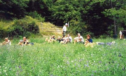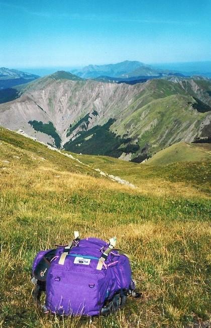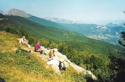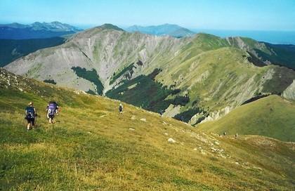 Neste dag fortsetter vi opp gjennom skogen og kommer raskt opp i høyden, der det er fritt utsyn over de omkringliggende myke åsene. Vi fortsetter på ryggen av høydedragene og befinner oss på toppen av Toskana’s høyeste fjell, Monte Prado, 2054 moh. Været er praktfullt, ikke en sky, helt vindstille, og vidt utsyn til alle kanter. Her spiser vi de medbrakte brødskivene, som kroverten har smurt til oss. Vi følger fjellkammen og avslutter dagen med en bratt nedstigning til Battisti.