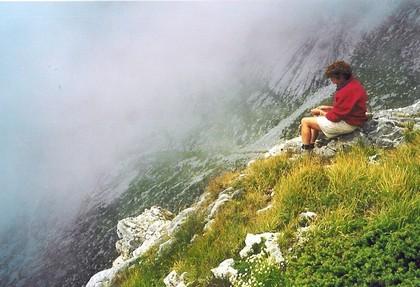 Christina, vår søte og dyktige guide fra TOPAS, har med en overraskelse til oss, som vi nyter på toppen - blåbær-grappa. Det luner, men det er likevel kjølig på toppen, så vi begir oss raskt nedover igjen. Pass på de løse steinene og beregn deg god tid!Senere bestemmer jeg meg for å bli igjen litt i høyden, mens de raskeste i gruppen forsvinner i disen under meg. Jeg kan høre stemmene deres en periode, men så senker stillheten seg. Alene i disen med den overdøvende stillheten venter jeg med håp om at det skal klarne opp. Men, nei, da de siste kommer ned fra fjellet, går vi ned til Conti, 1420 moh. Her var vi blitt lovet en alle tiders utsikt fra en flott plassert hytte. Men…….