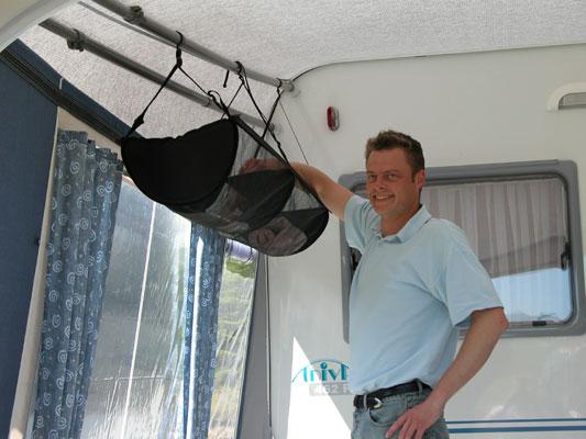 1. Toporganizer TMIsabella har utviklet flere forskjellige systemer for å holde orden i forteltet. Siste skudd på stammen er Toporganizer TM , som plasseres på en ekstra overligger og kan reguleres. Det mest praktiske er, at nettet er gjennomsiktig, så man kan stå under det og se hvor tingene er, uten å måtte ta det ned. Den avlange Tall Organizer plasseres på campingvognen. De øverste gjennomsiktige lommene er det fortsatt litt rotete å se på. De nederste lommene er kraftige nok til oppbevaring av sko.