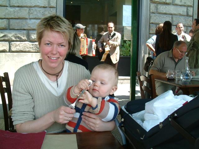 Vi ankom 3 timer senere til Firenze pga. kø de siste 30 kilometerene, så det var i ferd med å bli nokså sent. Våre amerikanske venner, som ventet på oss der nede, hadde bestilt bord på en av områdets beste spisesteder.Jeg skal ærlig innrømme, at jeg hadde mine betenkeligheter med å dra Mathias med på restaurant så sent på kvelden. Det var allerede langt over hans leggetid.Vi hadde kjørt hele dagen, så når ville hans grense være nådd? Og hvordan var forholdene på denne fine restauranten. Men det var absolutt ikke noe problem, verken for Mathias eller spisestedet. Vi ble ønsket velkommen og fikk flyttet litt rundt, slik at det ble plass til barnevognen. Mathias fikk sin flaske og falt straks i søvn, slik at vi andre kunne sitte og nyte et delikat måltid med allverdens spesialiteter fra det deilige Toscana.