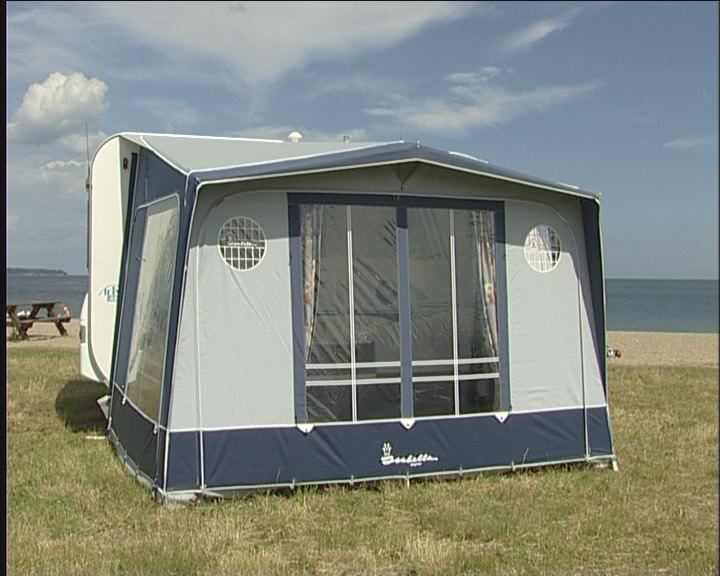 Dette understykket gjør at vinden ikke kommer inn i forteltet. Understykket settes fast i skinnen nederst på campingvognen og plugges fast til jorden.