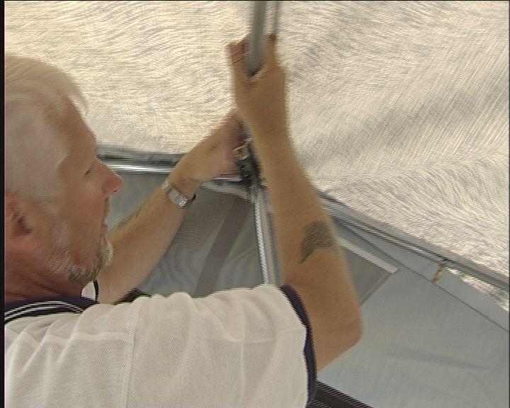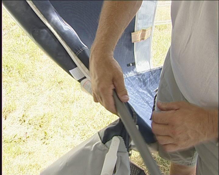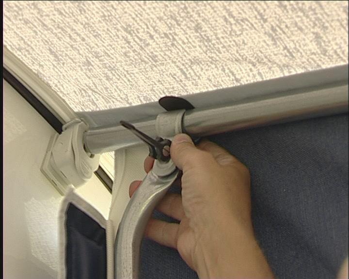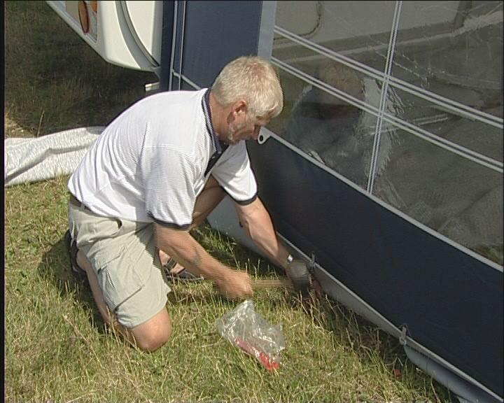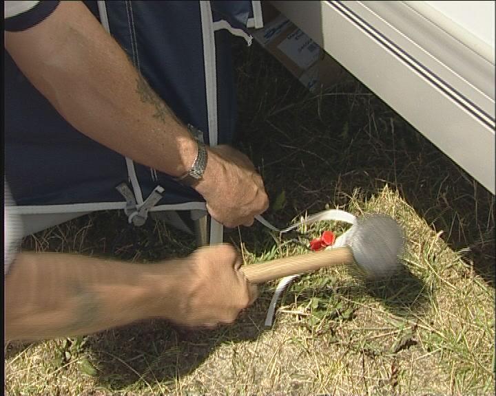 Start med å plugge helt inne ved campingvognen på begge sider. Det er viktig, at stangen og dermed teltduken står helt inn til vognen. Plugg også fotstroppen, slik at bakbeinet blir stående. Gjør det samme i den andre siden.