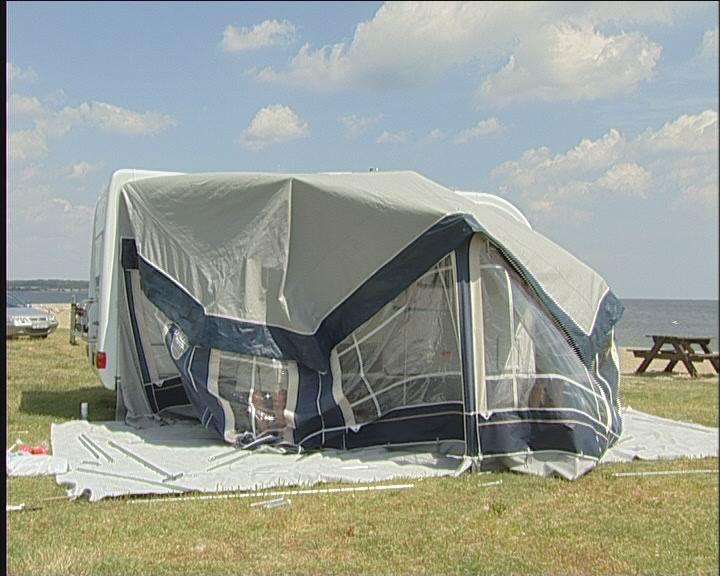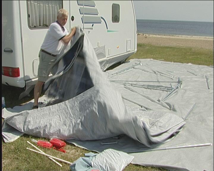 Fold teltduken ut og finn det hjørnet der du skal begynne å sette forteltet på campingvognen