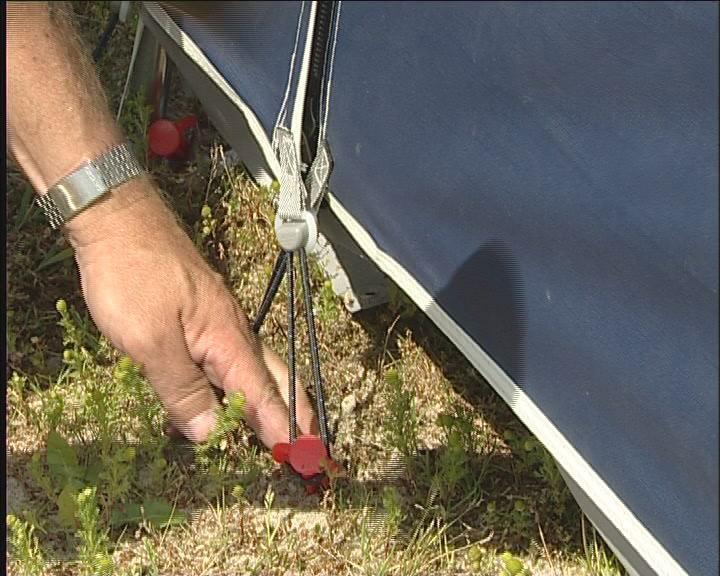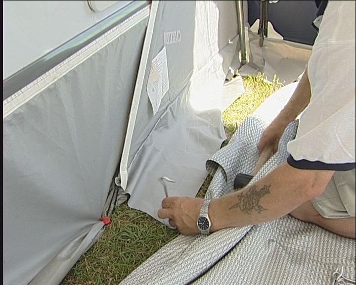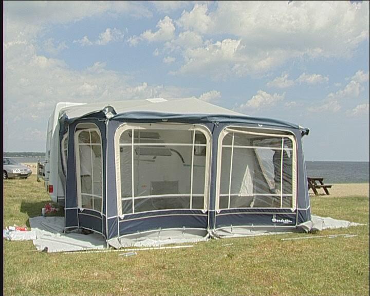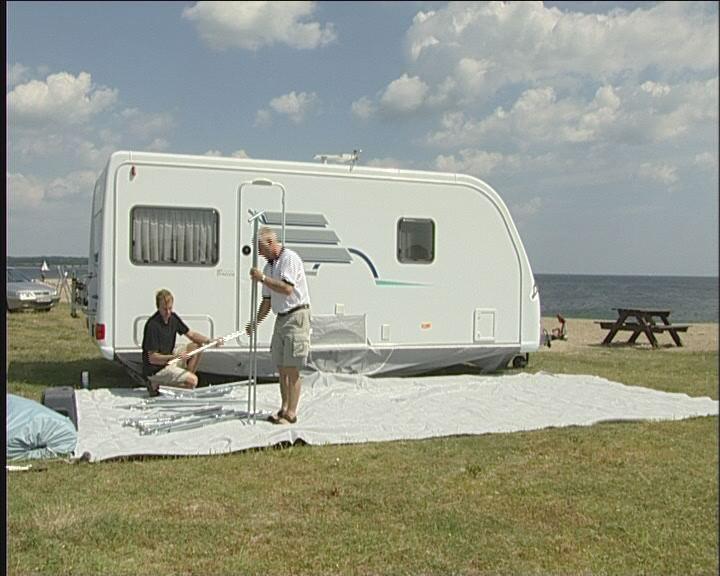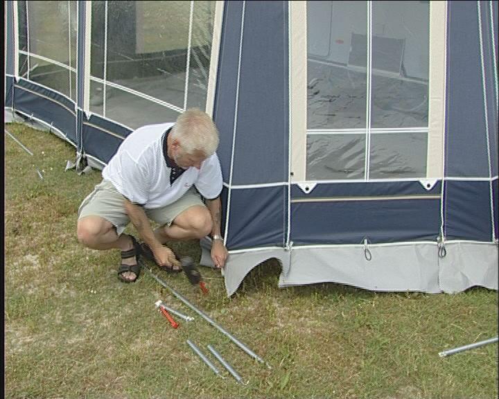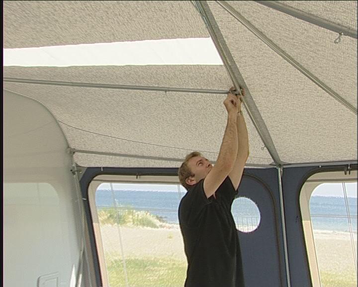 Bakbenet av teltet monteres på takstangen og settes i fotstroppen, så tett på campingvognen som mulig. Det gjør du i begge sider.