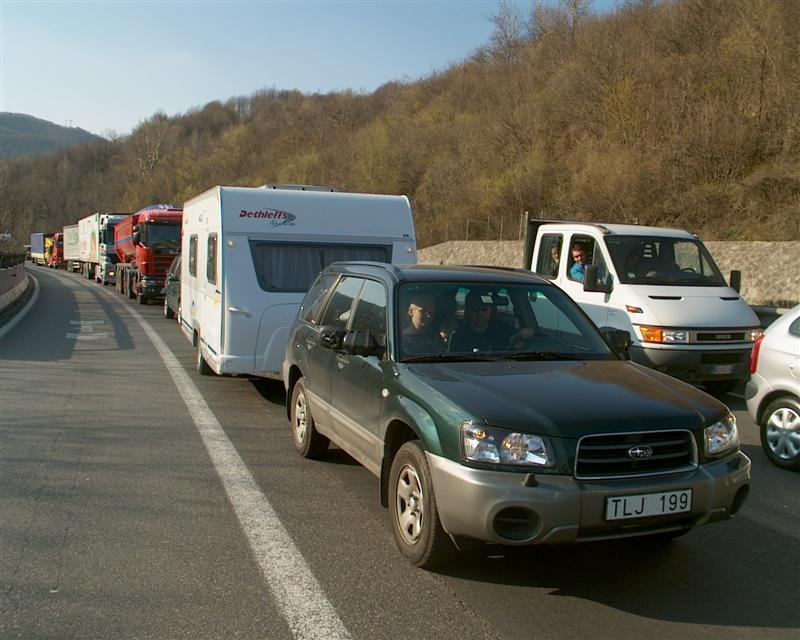 Risikoen for å bli stående i kø er stor både i Tyskland og Italia. Kan man språket, er radioen en hjelp til å orientere seg om situasjonen. Det er viktig å lufte godt ut i bilen og få noe å drikke og spise, når man står stille. Er det varmt utenfor er det enda viktigere. Gå helst ikke ut av bilen. Står man lenge i kø, kan barna for en kort stund spennes fri, så de kan bevege seg litt rundt. Så snart trafikken glir skal de spennes fast igjen. Såfremt det er mulig er det en fordel å kjøre inn på en rasteplass, hvor barna kan komme ut av bilen og leke. Her kan man få informasjon om situasjonen eller selv holde øye med veien. Sjekk evt. om veiarbeid før avreise.