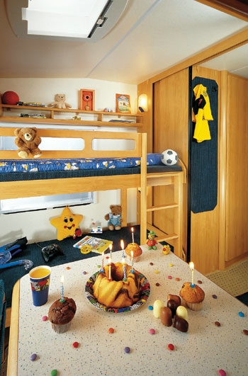 Voksenavdelingen er plassert i forenden. Her er en stor dobbeltseng og et deilig stort bad og toalett. Voksenavdelingen avskjermes delvis fra sittegruppen ved hjelp av skap og hyller, der det eksempelvis kan plasseres en TV.Sittegruppens plassering har en god samlende funksjon. Her kan barn og foreldre hygge seg med spill eller film. Og hvis det ikke skulle være moro nok for de små, kan de boltre seg i barneværelset bak i vognen. Her har Hobby nemlig plassert en køyeseng, som raskt og enkelt kan gjøres om til en liten lekeplass. Den spesielle lysinnretningen med lyskilder i hjørnene gjør det mulig å skape den perfekte kveldsatmosfære. På den måten kan barna sove, mens far og mor kan hygge seg med hverandre i rundsittegruppen.