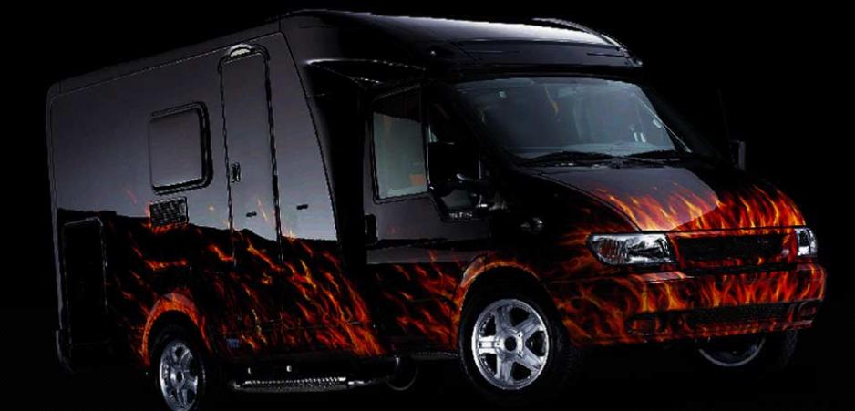 Hymer har i alle fall tatt steget fullt ut med Tuning Van, som er basert på Hymer Van, men der Hymer har samarbeidet med 12 forskjellige leverandører for å få fram en av de mest oppsiktvekkende bobilene på lenge. Utvendig er bilen sortlakkert, før den er flammelakkert med 24 lag med lakk.Så er det satt på brede 18-tommers dekk, og ekstra tøffe eksosrør, for å gi bilen sitt tøffe utseende.