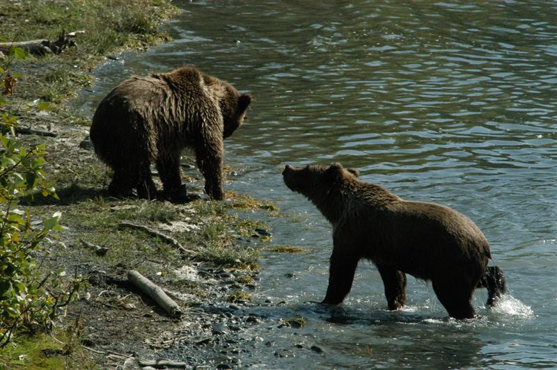 Den neste store opplevelsen denne dagen er landgangen. Vi har vadere på og går de siste meterne til land. Bjørnen med den lille ungen har gått inn i skogen, men skogen er så tett, at jeg ikke kan se om den står en meter inne og holder øye med oss. De andre bjørnene går og roter i vannet etter mat og virker helt uberørt av vår ankomst. Vi går opp langs elven på en lang rekke. Vi må gjerne snakke, men ingen sier forståelig nok ikke et ord. Spenningen er intens. Vi er til de grader i bjørneland. Piloten vår er samtidig vår guide, men han er ubevepnet. Han forteller at han har vært her de siste fem sesongene. Jeg bestemmer meg for å holde meg i nærheten av han… Et stykke oppe langs elven, ved et godt fiskested, setter vi oss på en sandbanke med høyt gress og venter. Det går bare få minutter før den første bjørnen kommer forbi.