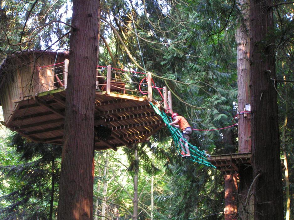 Det mest spektakulære er imidlertid muligheten for å campe i de såkalte tretopphyttene plassert opp til 13 meter over bakken. To forskjellige steder er det grupper av tretopphytter inne i skogen, der man kan få lov å bo. Etter en grundig instruksjon iføres man hjelm samt sele med karabinkroker. For å komme opp til hytten må man klatre opp i et tre via en stige. Herfra er det et par hindringer på en klatrebane, som må passeres, før man kommer fram til tretopphytten. En utfordring, men ikke større enn at de fleste saktens kan gjennomføre turen. Utvendig er de kledd med tre og innvendig er de innredet som et alminnelig hus med seng (evt. myggnett), bord og stoler samt toalett. Det er imidlertid ikke innlagt vann og el og her er det mulig å bo i nærkontakt med naturen.Vi følger en gruppe, som er iferd med å ”innta” sin tretopphytte og de er alle i 50-årene. Det er uhyre populært å overnatte på denne måten og tretopphyttene er utsolgt lang tid i forveien, så vil man prøve dette helt unike konseptet, bør man bestille i god tid. Etter den første instruksjonen og klatring opp til tretopphytten skal man på egen hånd kunne komme opp og ned via den anviste ruten.