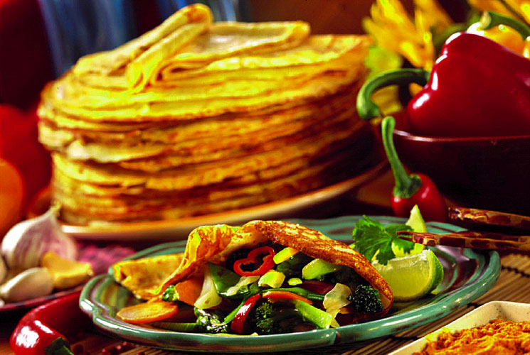 1 porsjon pannekakerøre1 bunt koriander eller andre urterFyll:salatrøkt kalkunpåleggstekt bacon i bitertomatterningersquashLag pannekakerøre på vanlig måte, men av 1 dl mindre melk. Grovhakk korianderen og mos den i en hurtigmikser sammen med melken. Hell koriandermelken opp i pannekakerøren og la den svelle ca. 15 minutter før steking. Ha litt smør i en litt liten panne og hell på mer røre enn til vanlige pannekaker. Stek ved lav til middels varme. Snu pannekakene når de har fått fin farge under og røren har stivnet oppå. Fyll pannekakene og brett dem sammen.