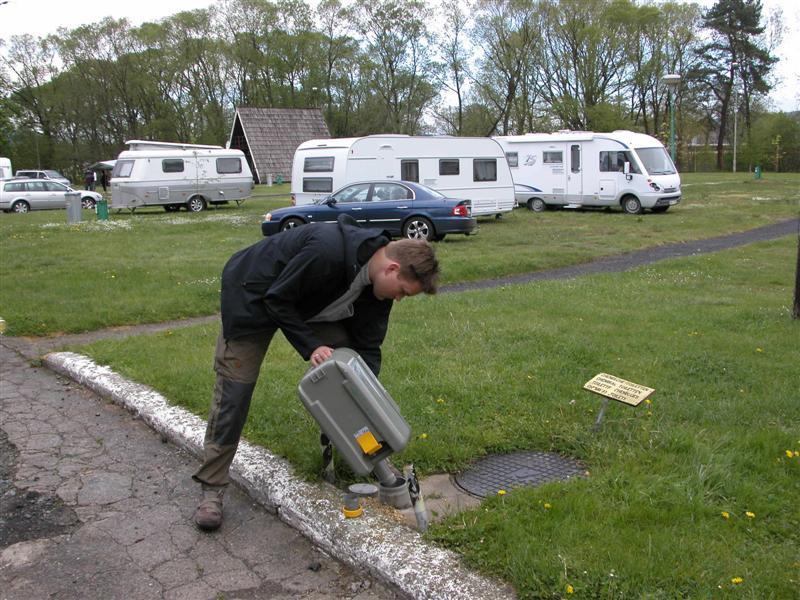 Der det kommer noe inn, skal det som regel også ut igjen. Rasmus er gått på oppdagelsesferd på campingplassen for å finne stedet, der vi kan tømme toalettet vårt. Det er ikke enkelt å finne, da det viser seg å være et lite hull i veikanten – direkte ned i kloakksystemet. Campingplassen tilsvarer en en- eller to-stjerners plass i Danmark. Servicen er imidlertid helt på topp.