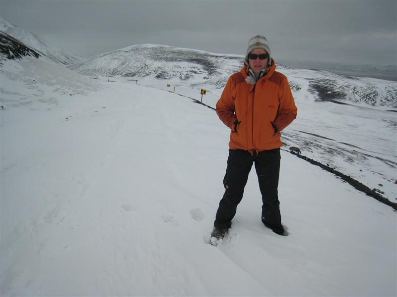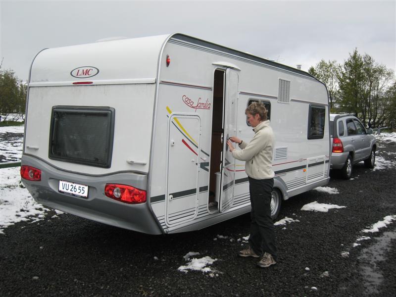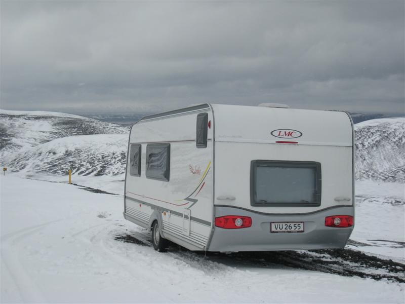 Vi hekter av campingvognen, mens Rasmus går til fots omtrent en ½ kilometer fram for å sjekke veiforholdene. Han kommer tilbake og forteller, at det ser ut som om det bare dreier seg om 2-300 meter med 20-30 cm snø. Han kjører turen et par ganger for å lage spor til oss. Mens han gjør det kommer det en islending i en Toyota Landcruiser, og bekrefter at det bare er dette stykket, hvor det ligger så mye snø. Vi hekter på igjen og alle tre vogntogene kommer fint gjennom den dype snøen. Campingvognen fordi den har en bra trekkbil. Teltvognen fordi den bare følger med. Bobilen spant litt, men Oles erfaringer gjorde at han også kom fint igjennom.- Det handler om å kjøre i det riktige gear og holde et godt moment – imidlertid uten å kjøre for hardt. Altså finne balansen mellom fornuftig fart og ikke kjøre seg fast. I følge Ole.