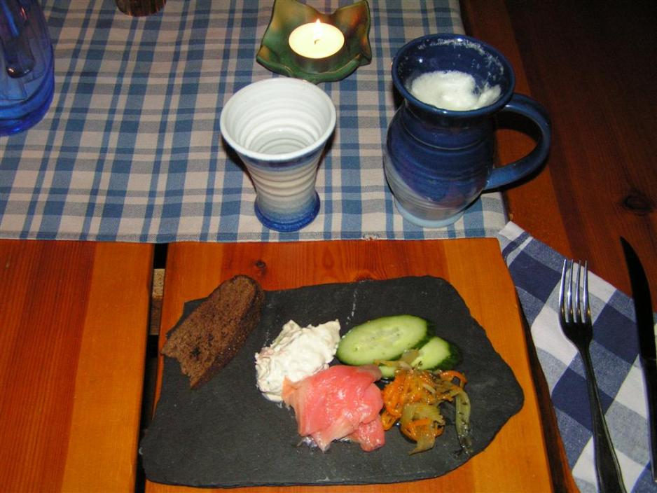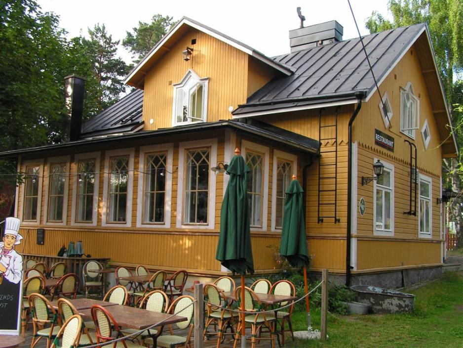 12 km før vi kommer til Nådalen svinger vi inn på Skjærgårdsrestauranten Pohjakulma, der en buffet med diverse hjemmelagde retter skal glede vår gane og slunkne mager. Her fås strømning (en liten fisk) i diverse varianter og svært så velsmakende. En spesiell stekt potet- og grønnsaksmos med ost (som normalt bare serveres i Finland rundt jul, kan her fås året rundt) og kjøttboller (som mor laget dem). Naturligvis er det salatbar og dessert. Drikkevarene er enten saft eller spesialiteten, det hjemmelagede ølet etter en gammel, hemmelig oppskrift. Den er søt som juleøl, men ikke fullt så mørk og tykk, og med et lite innslag av eplesmak. Forfriskende.Med fornyede krefter sykler vi videre mot målet vårt Naantali/Nådendal, men været slår om og vi får, noe som er nokså uvanlig på disse kanter, en regnbyge. Naantali/Nådendal ligger selvsagt rett ved havet, beskyttet av øyer i skjærgården og har flest tørrværsdager med solskinn i hele Finland.