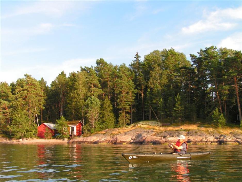 Nede ved stranden møter vi Frederik Borg fra Nagu Kajak som skal ta oss med på fisketur. Ikke fra land eller båt, men fra fiskekajakk. Fartøyet er en blanding av en kano og en kajakk, en kanojak!, som er veldig stabil og utstyrt med sidelomme til fiskeutstyr og en fordypning i relingen til å sette fiskestangen i, mens man padler mellom fiskeplassene.Utstyrt med redningsvest og ganske få instruksjoner setter vi ut fra land og glir ut i det stille skjærgårdsvannet. Her venter bla. gjedda, Frederik forteller at han dagen før har fanget en 12 kg tung gjedde og deler gjerne med seg av sin er erfaring om hvor gjeddene står.Selv om vi er flere som forsøker oss i et par timer er det ingen som lykkes med å fange noe i dag. Men en tur i den deilige kveldsolen mellom øyenes sivbevokste klippeskjær kan absolutt anbefales.