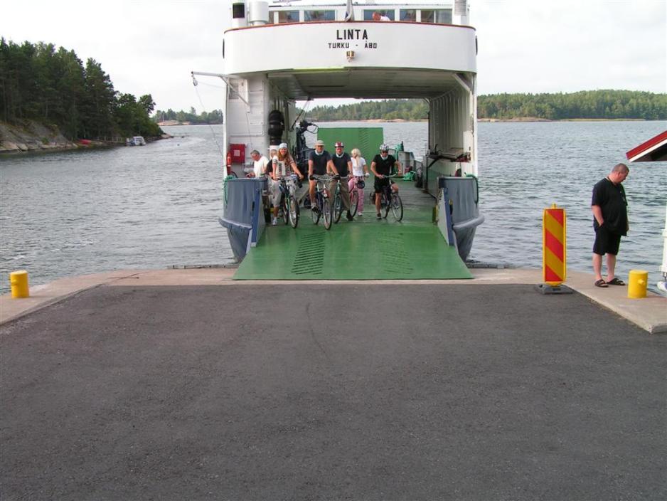 Vi har fått utlevert våre 7-girs sykler og justert setene, slik at de passer i høyden. I sykkelveskene har vi det vi skal bruke på den 37 km lange turen som vi har foran oss og går om bord i fergen til Hanka.Fergen gjør underveis et kort opphold ved øya Seli/Själö der det mellom 1600 og 1800 lå et sykehus for spedalske. I dag ligger Skjærgårdshavets Forskningsstasjon, som sorterer under Turkus Universitet, på øya.På Hanka sykler vi bortover skjærgårdsøya og opplever både natur- og kulturlandskapet fra sin beste side. Her er bakker med jevn stigning og lange (deilige) nedoverbakker. Sykkelturen foregår hele tiden på asfaltvei med liten biltrafikk. I veikanten ser man klipper med skog, der bunnen er dekket av blåbærlyng og andre steder har form av en blomstereng. Innimellom kommer vi forbi oppdyrket mark, der høsten nettopp er overstått. Så er det igjen utsikt til vann og siv i standkanten. Vi kommer inn på nok en liten gul ferge, som bringer oss fram til Rymättylä/Rimito, der skjærgårdsidyllen fortsetter.