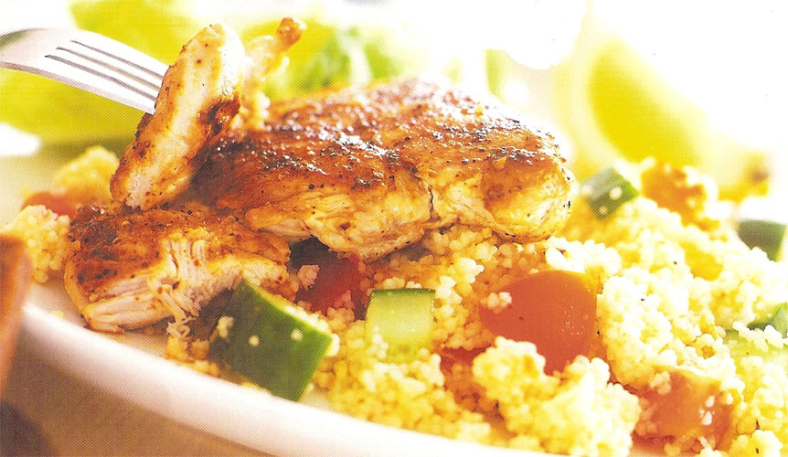 4 pers.4 kyllingfiléer3 dl couscous4 tomater1/2 agurk1 sitronPensl kyllingfiléene med 1 ss olje og krydre med 1 ts salt, 1 krm pepper og gjerne 1 ts paprikapulver. Grill kyllingfiléene runt hele i ca 10 minutter. Kontroller at kyllingen er gjennomstekt dvs at kjøttsaften er klar uten innslag av rosa. Kok opp 3 dl vann med 1/2 ts salt. Tilsett couscous og la det stå ca 5 minutter. Skyll og skjær tomater og agurk i terninger. Halver og press saften av sitronen. Bland sitronsaften med 2 ss olje, 1/2 ts salt og 1 krm pepper. Bland grønnsaker og dressing med couscousen. Server kyllingfiléene med den lunkne couscoussalaten, brød og grønne salatblad.